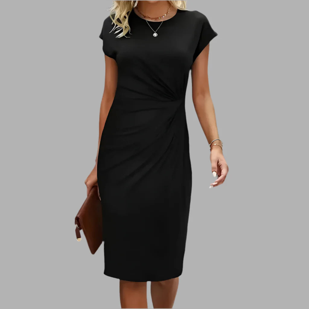 Ponadczasowa czarna sukienka o długości midi to połączenie klasy i prostoty. Miękki, elastyczny materiał idealnie dopasowuje się do sylwetki, a delikatne marszczenie z boku subtelnie podkreśla figurę. Doskonała do biura, na spotkania i wieczorne wyjścia.